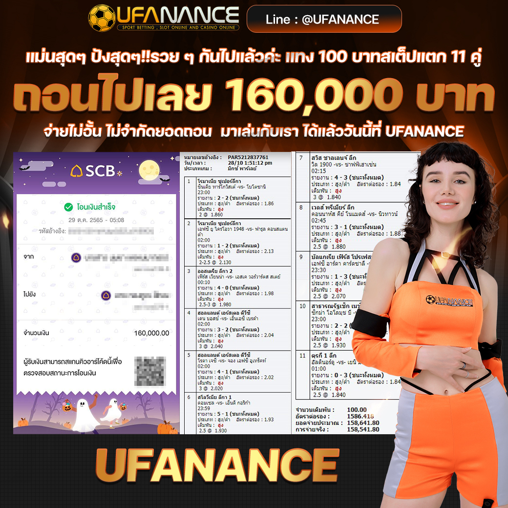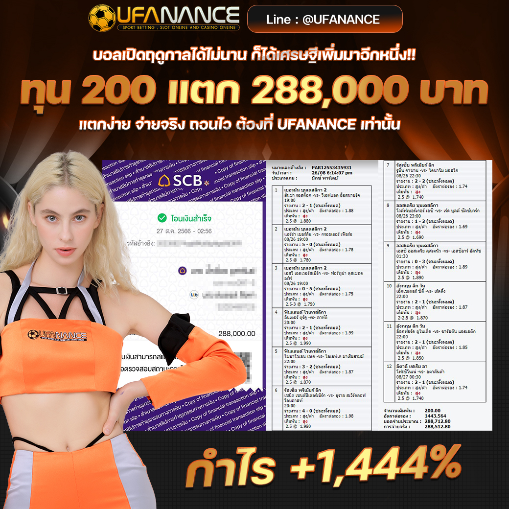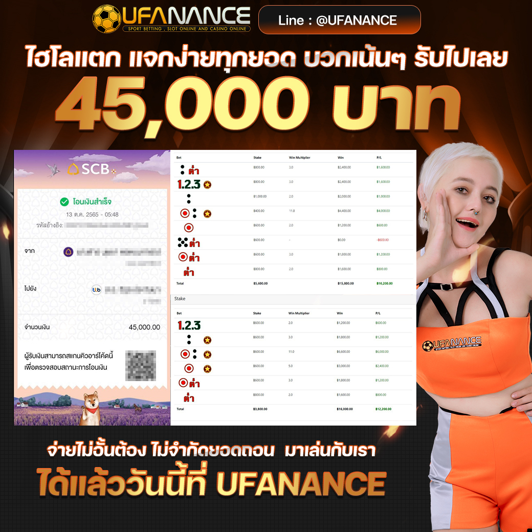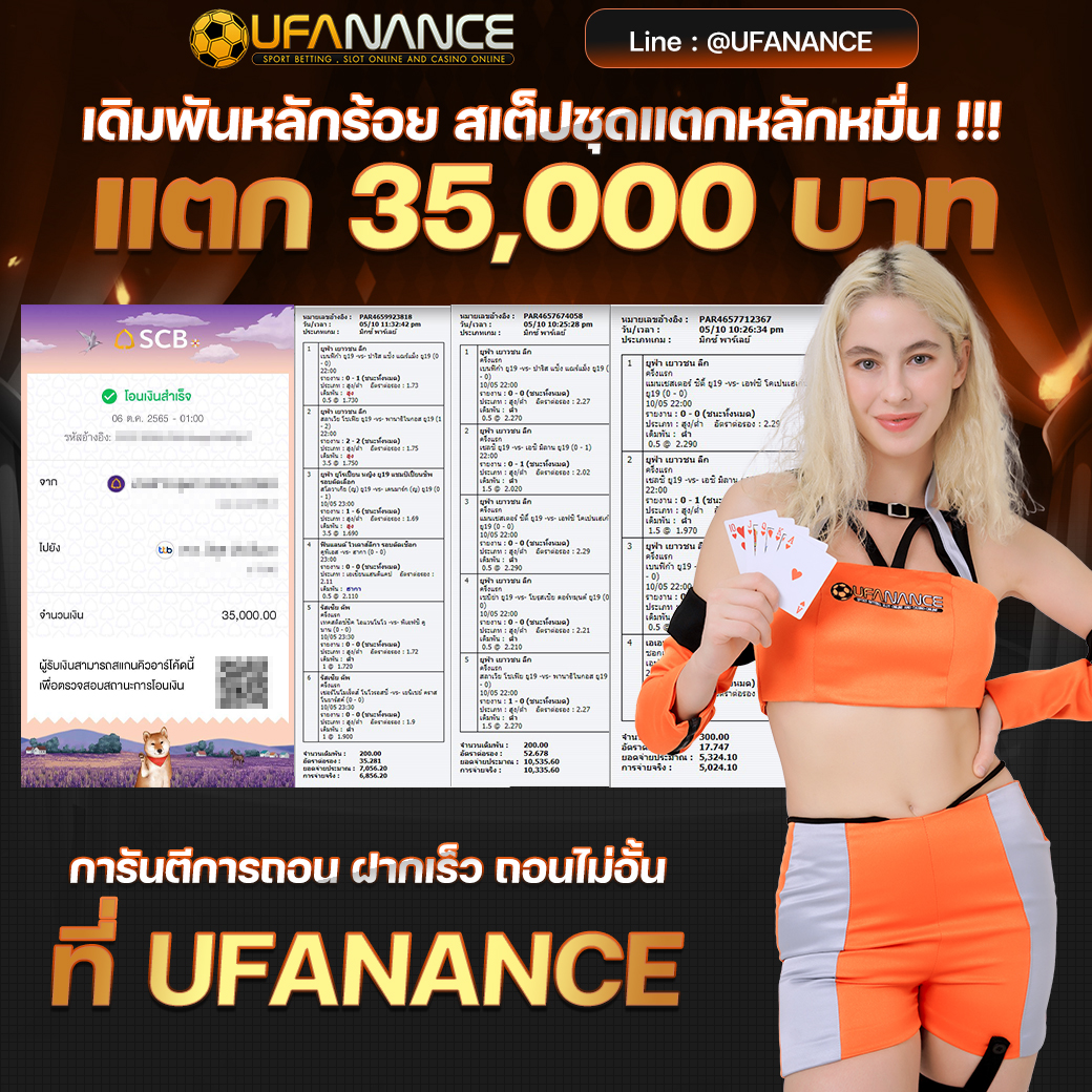 UFANANCE เป็นเว็บตรงจากเครือ UFA BET ซึ่งเป็นผู้ให้บริการพนันออนไลน์ที่ดีที่สุด มาตรฐานระดับสากล มีเกมส์ให้เลือกเดิมพันหลากหลายไม่ว่าจะเป็น แทงบอลออนไลน์ บอลเดี่ยว บอลสเต็ป เกมส์บาคาร่าจากค่ายดังๆ เกมส์สล็อตที่แตกง่ายมากๆ และหวยออนไลน์ เช่น หวยรัฐบาล หวยยี่กี่ หวยหุ้น และอื่นๆอีกมากมายไว้ให้บริการ โดยระบบเว็บเราเป็นระบบที่ฝาก-ถอน AUTO ภายใน 10 วินาที ทำให้ลูกค้าไม่ต้องรอนาน พร้อมทั้งมีทีมงานมืออาชีพคอยดูแลลูกค้าตลอด 24 ชั่วโมง รวมไปถึงการให้บริการต่างๆ สุดพิเศษที่ลูกค้าหาไม่ได้จากที่ไหน หากท่านมีข้อสงสัยหรือต้องการคำปรึกษากรุณา ติดต่อสอบถาม CALL CENTER ได้ตลอด 24 ชั่วโมง. หรือ ทักแชทไลน์มาได้เลย LINE ID : @UFANANCEV4