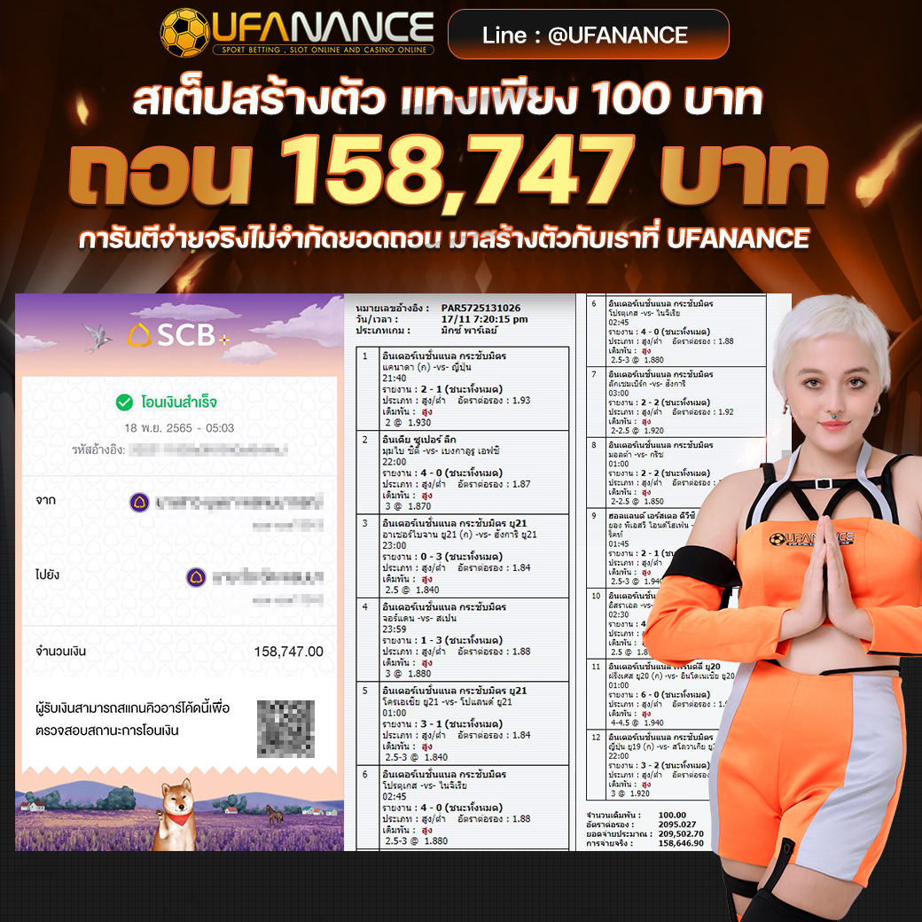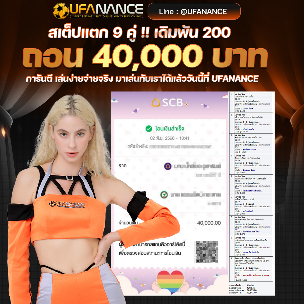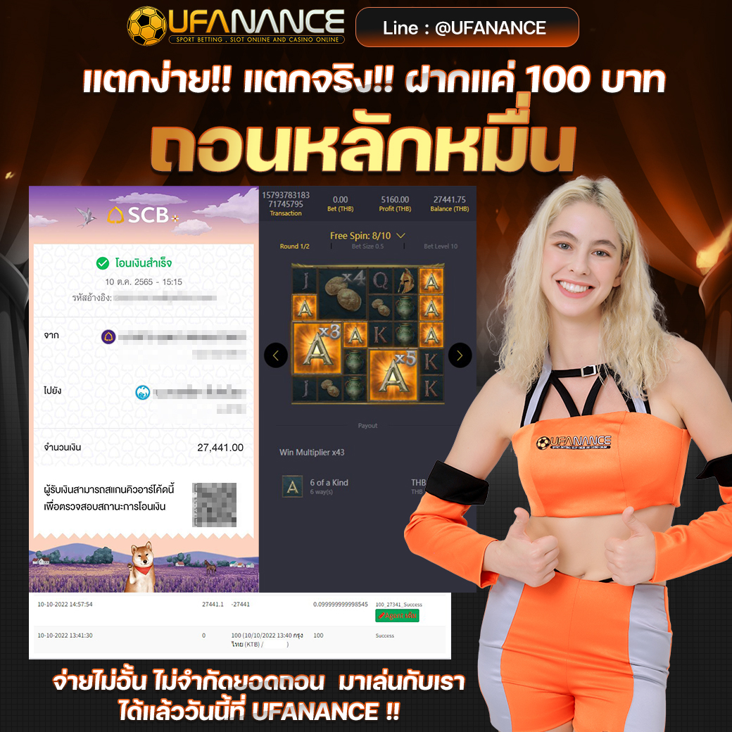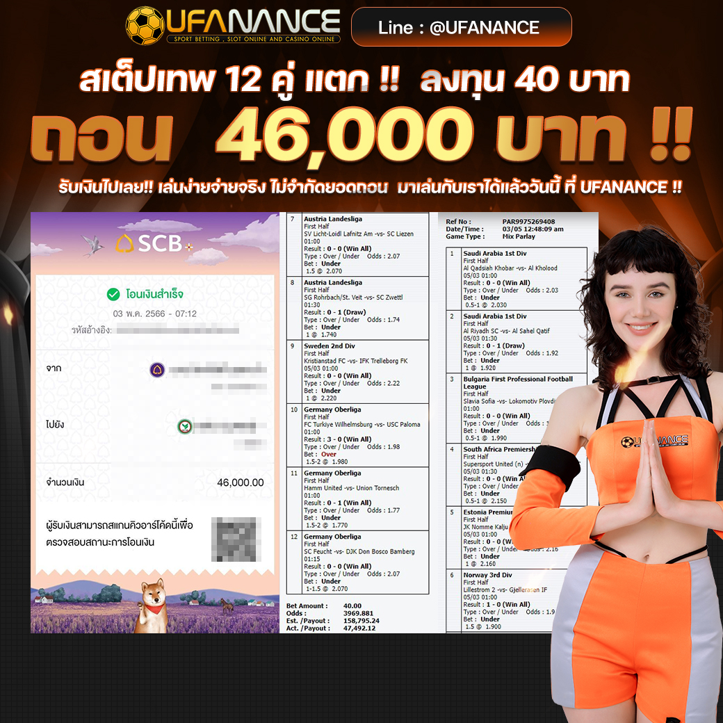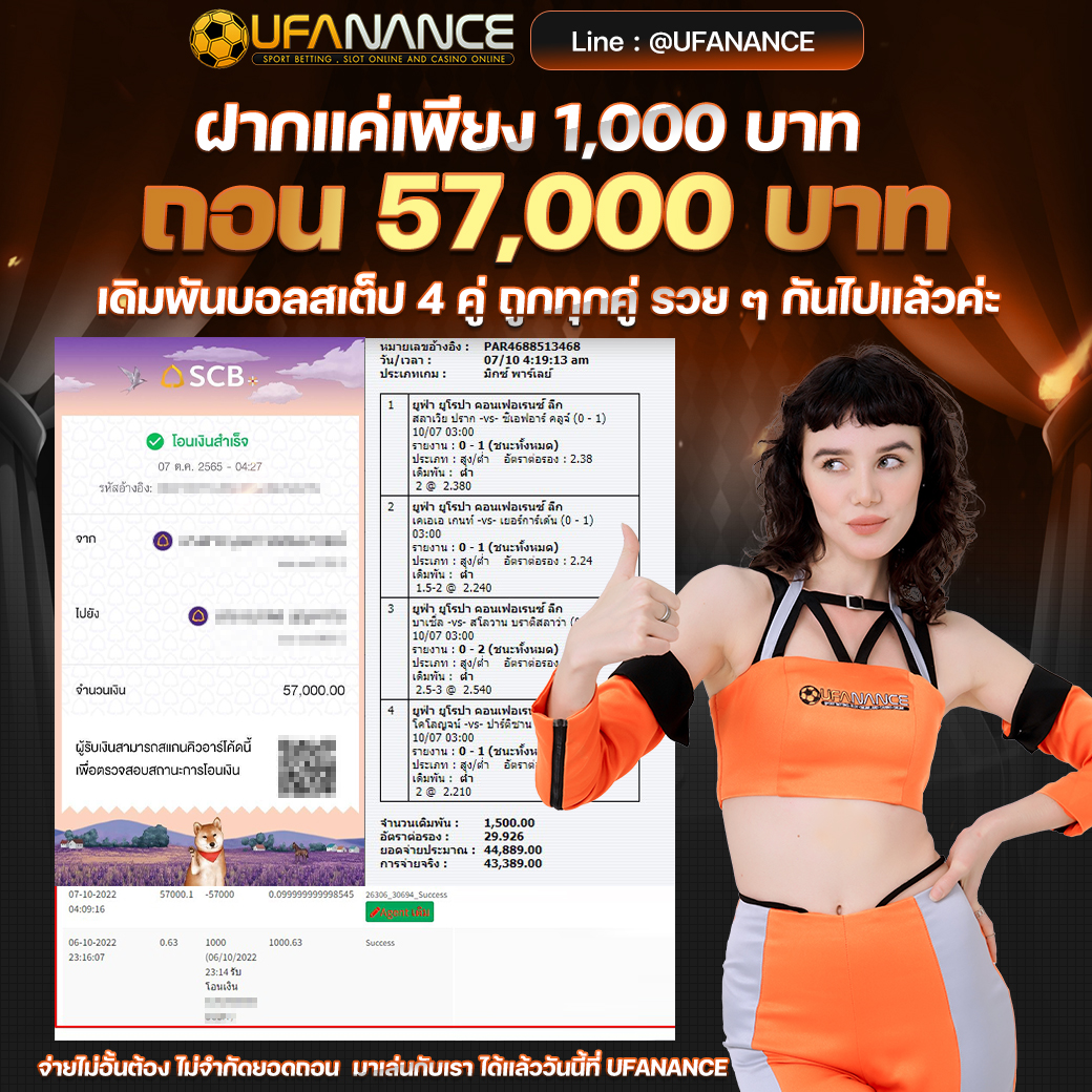 UFANANCE เป็นเว็บตรงจากเครือ UFA BET ซึ่งเป็นผู้ให้บริการพนันออนไลน์ที่ดีที่สุด มาตรฐานระดับสากล มีเกมส์ให้เลือกเดิมพันหลากหลายไม่ว่าจะเป็น แทงบอลออนไลน์ บอลเดี่ยว บอลสเต็ป เกมส์บาคาร่าจากค่ายดังๆ เกมส์สล็อตที่แตกง่ายมากๆ และหวยออนไลน์ เช่น หวยรัฐบาล หวยยี่กี่ หวยหุ้น และอื่นๆอีกมากมายไว้ให้บริการ โดยระบบเว็บเราเป็นระบบที่ฝาก-ถอน AUTO ภายใน 10 วินาที ทำให้ลูกค้าไม่ต้องรอนาน พร้อมทั้งมีทีมงานมืออาชีพคอยดูแลลูกค้าตลอด 24 ชั่วโมง รวมไปถึงการให้บริการต่างๆ สุดพิเศษที่ลูกค้าหาไม่ได้จากที่ไหน หากท่านมีข้อสงสัยหรือต้องการคำปรึกษากรุณา ติดต่อสอบถาม CALL CENTER ได้ตลอด 24 ชั่วโมง. หรือ ทักแชทไลน์มาได้เลย LINE ID : @UFANANCEV4