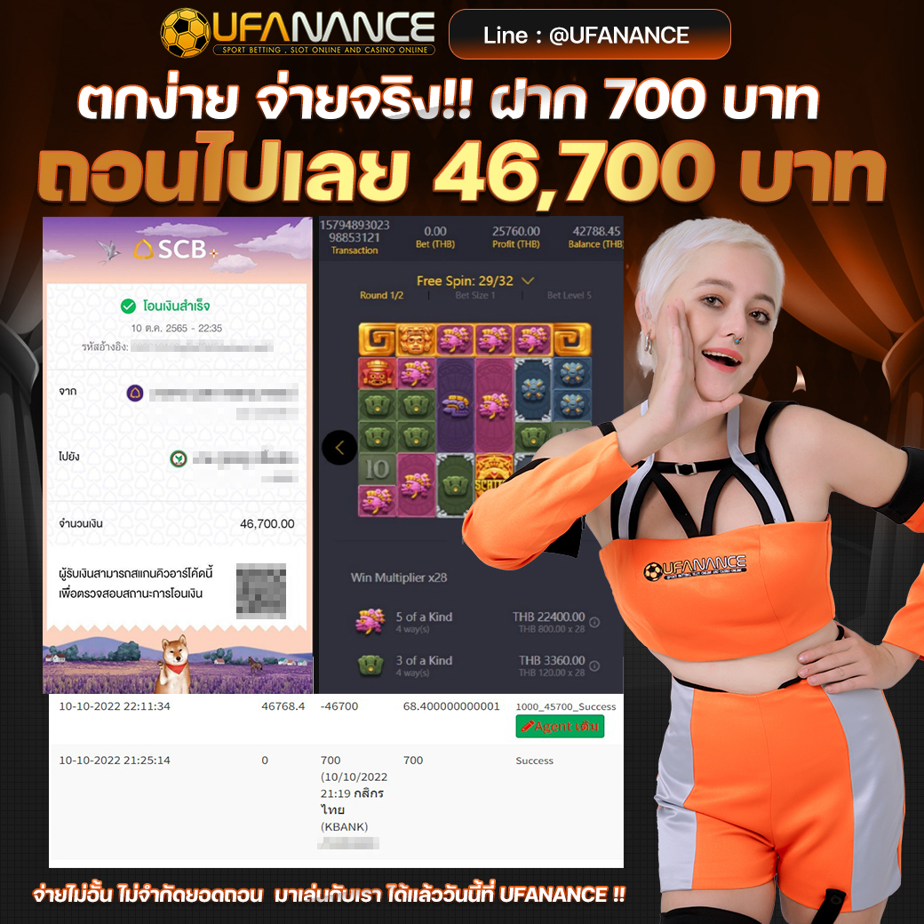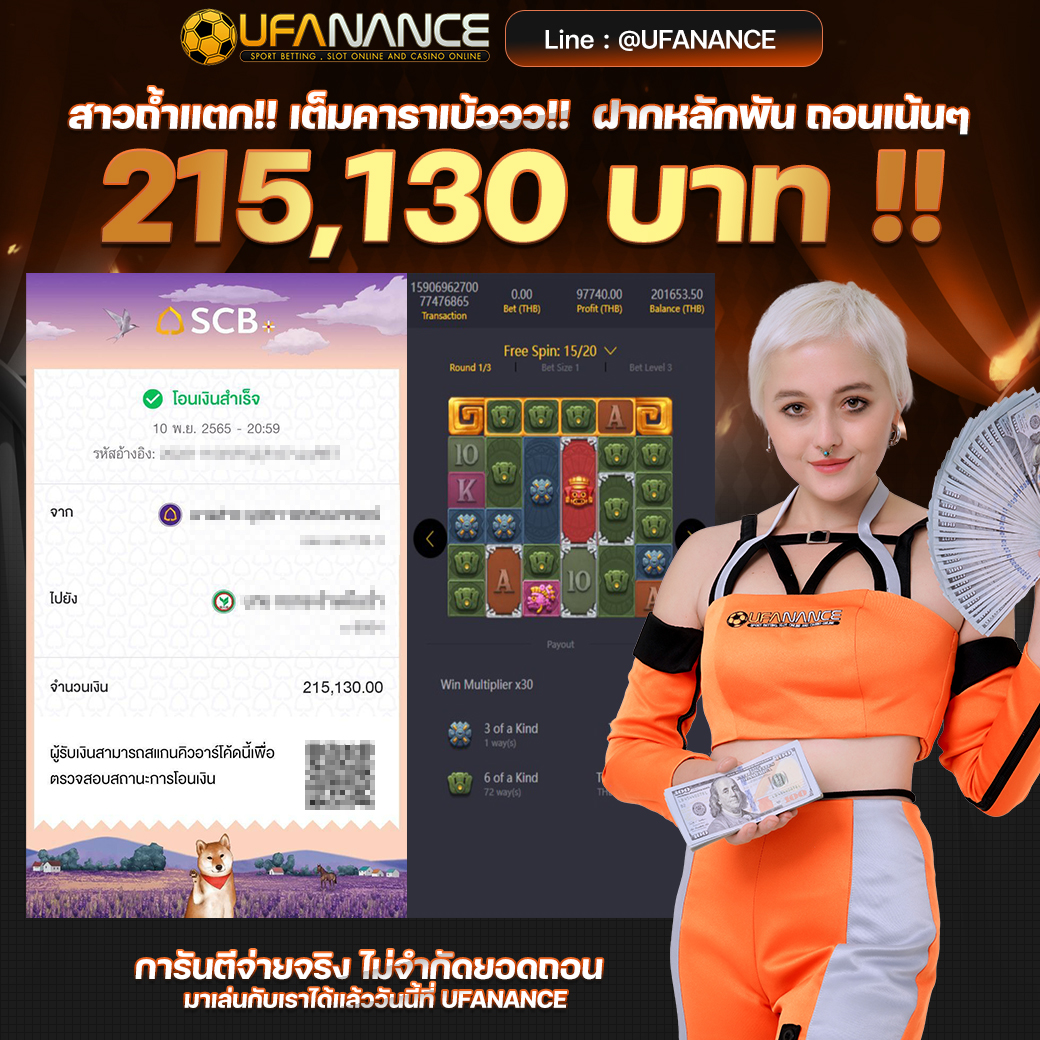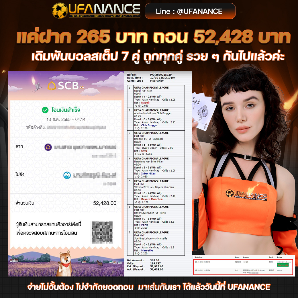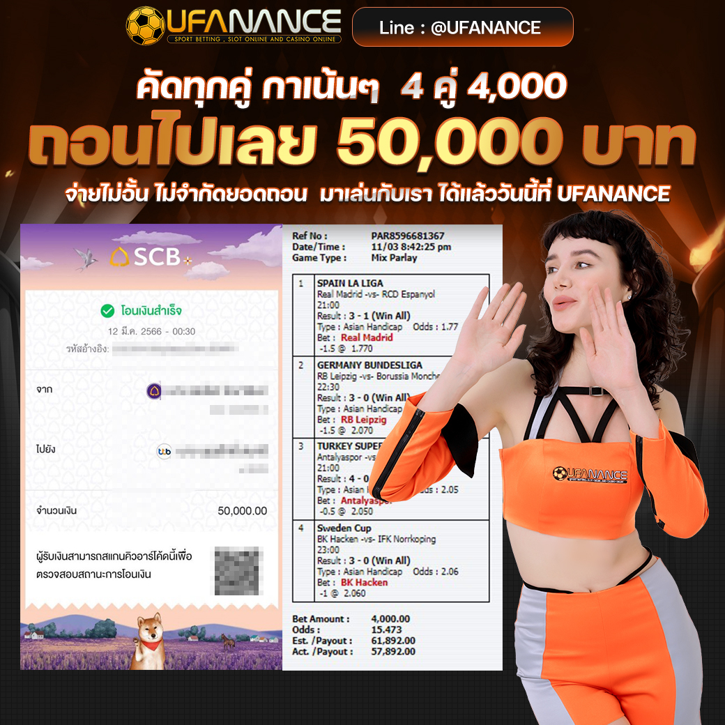 UFANANCE เป็นเว็บตรงจากเครือ UFA BET ซึ่งเป็นผู้ให้บริการพนันออนไลน์ที่ดีที่สุด มาตรฐานระดับสากล มีเกมส์ให้เลือกเดิมพันหลากหลายไม่ว่าจะเป็น แทงบอลออนไลน์ บอลเดี่ยว บอลสเต็ป เกมส์บาคาร่าจากค่ายดังๆ เกมส์สล็อตที่แตกง่ายมากๆ และหวยออนไลน์ เช่น หวยรัฐบาล หวยยี่กี่ หวยหุ้น และอื่นๆอีกมากมายไว้ให้บริการ โดยระบบเว็บเราเป็นระบบที่ฝาก-ถอน AUTO ภายใน 10 วินาที ทำให้ลูกค้าไม่ต้องรอนาน พร้อมทั้งมีทีมงานมืออาชีพคอยดูแลลูกค้าตลอด 24 ชั่วโมง รวมไปถึงการให้บริการต่างๆ สุดพิเศษที่ลูกค้าหาไม่ได้จากที่ไหน หากท่านมีข้อสงสัยหรือต้องการคำปรึกษากรุณา ติดต่อสอบถาม CALL CENTER ได้ตลอด 24 ชั่วโมง. หรือ ทักแชทไลน์มาได้เลย LINE ID : @UFANANCEV4